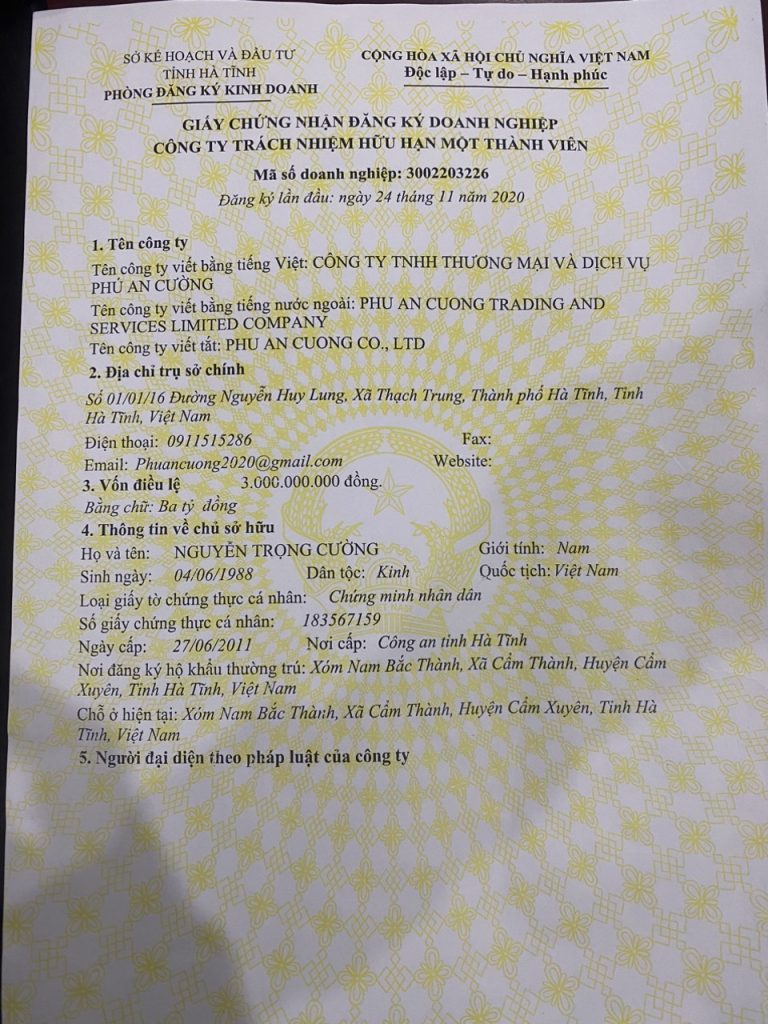 7. GIẤY PHÉP KINH DOANH CÔNG TY TNHH & TMDV PHÚ AN CƯỜNG